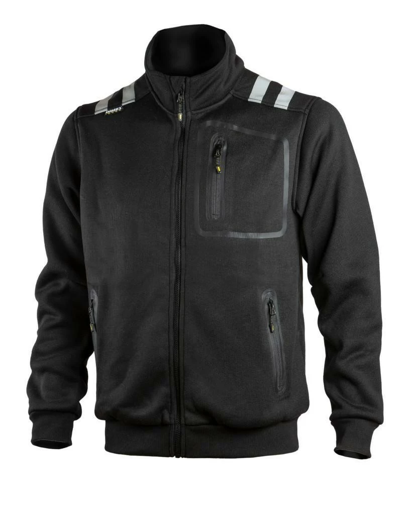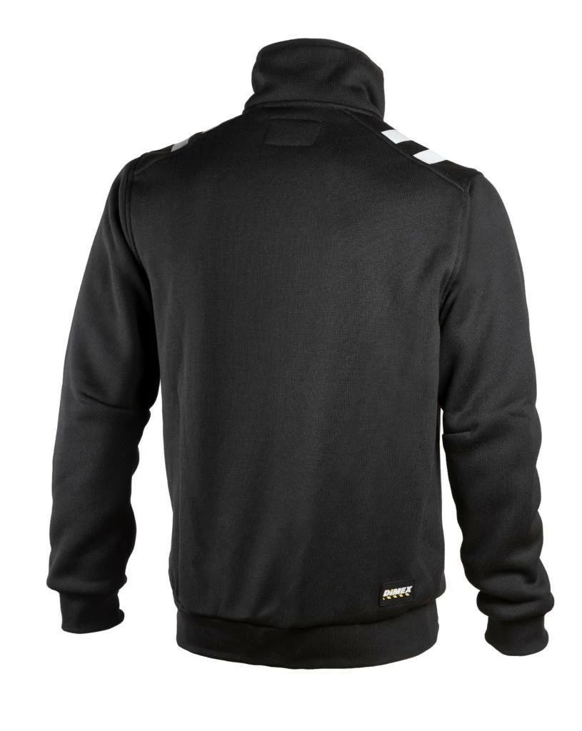 Tyylikäs musta neulostakki Dimexiltä sopii niin päällystakiksi tuon lämmittäväksi välikerrokseksi. Monipuolisilla yksityiskohdilla varustetusta takista löytyy; vetoketjullinen rintatasku, D-lenkki, vetoketjulliset alataskut ja avoimet sisätaskut. Takin helmaa ja hihansuita koristaa näyttävä musta resori, olalla heijastinpainatukset. Tämä takki on liitettävissä Dimex miesten turvakuoritakin 6109 sisätakiksi.