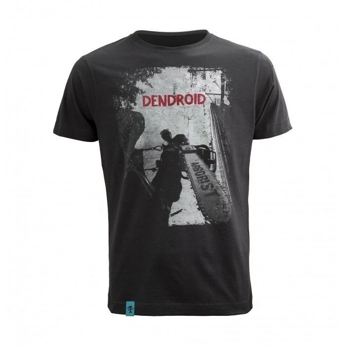 Dendroid laadukas t-paita arboristeille ja kaikille muille. Sopii niin työ käyttöön kuin vapaa-aikaankin. Edessä iso printti kuva. Takana olkapäässä Dendroid puulogo. 100 % puuvillaa.