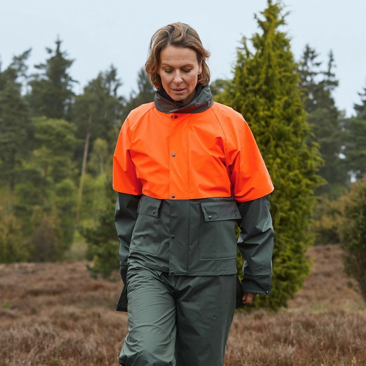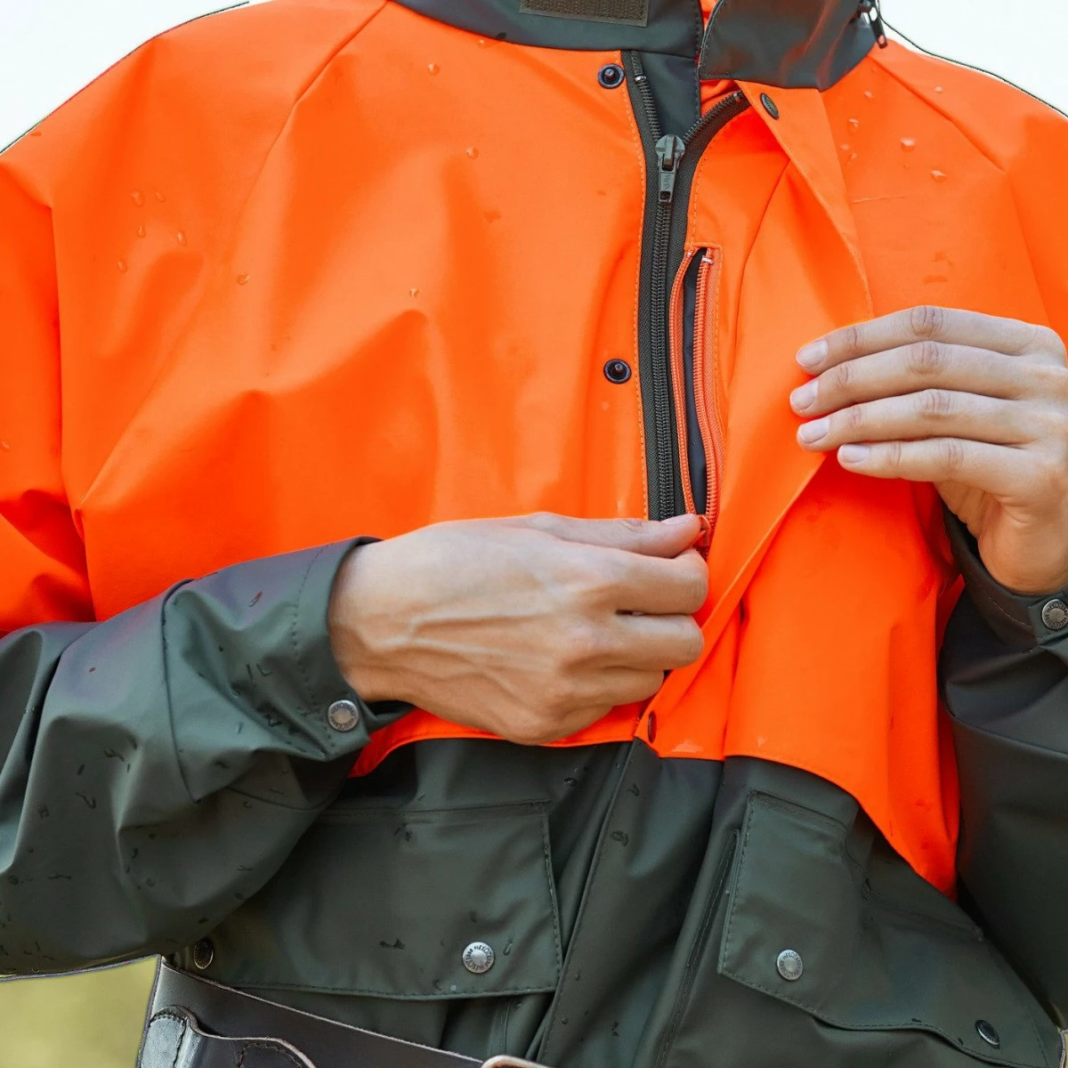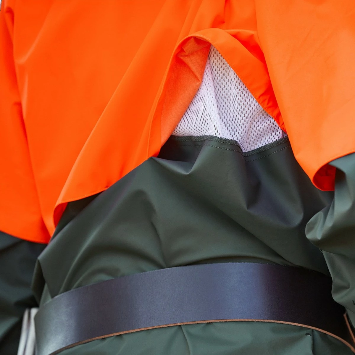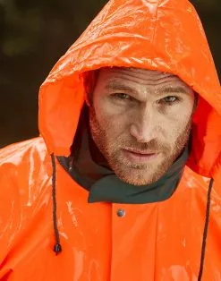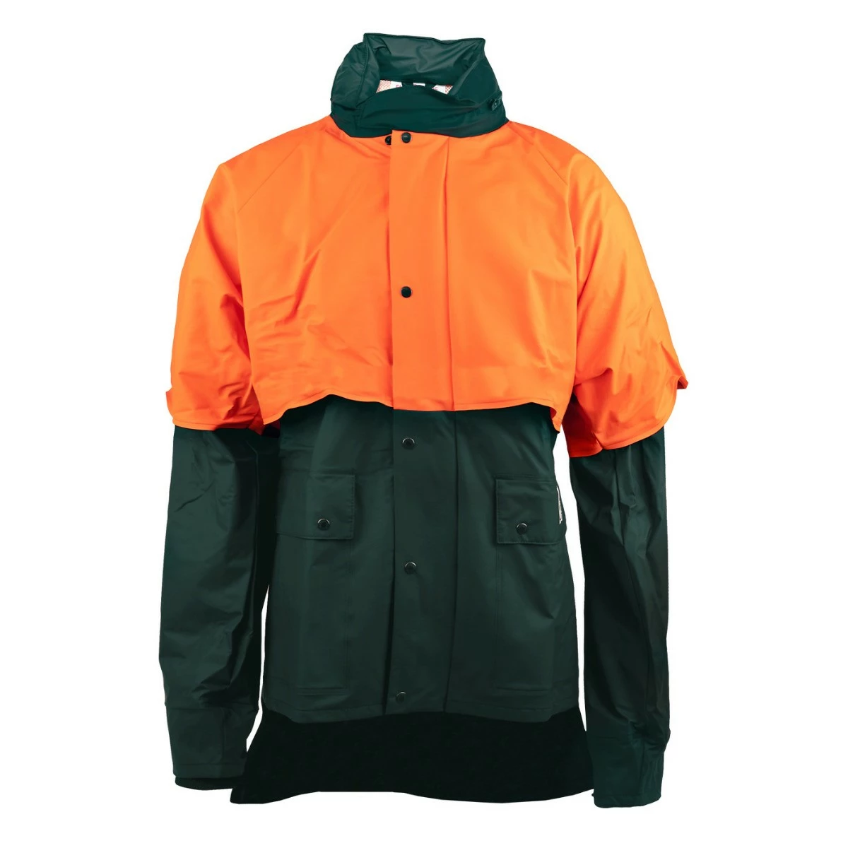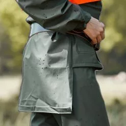Materiaali kestää öljyjen ja kasvinsuojeluaineiden altistusta. Verkkokangasvuori lisää käyttömukavuutta. Sadetakin kauluksessa huppu.