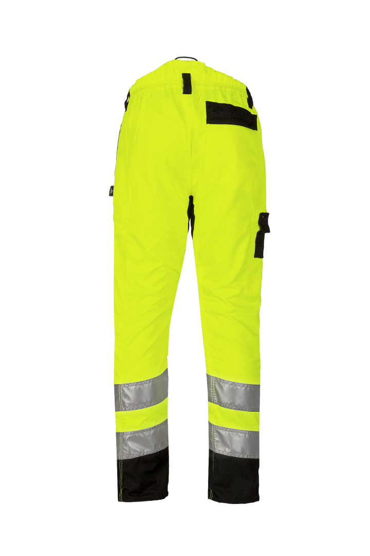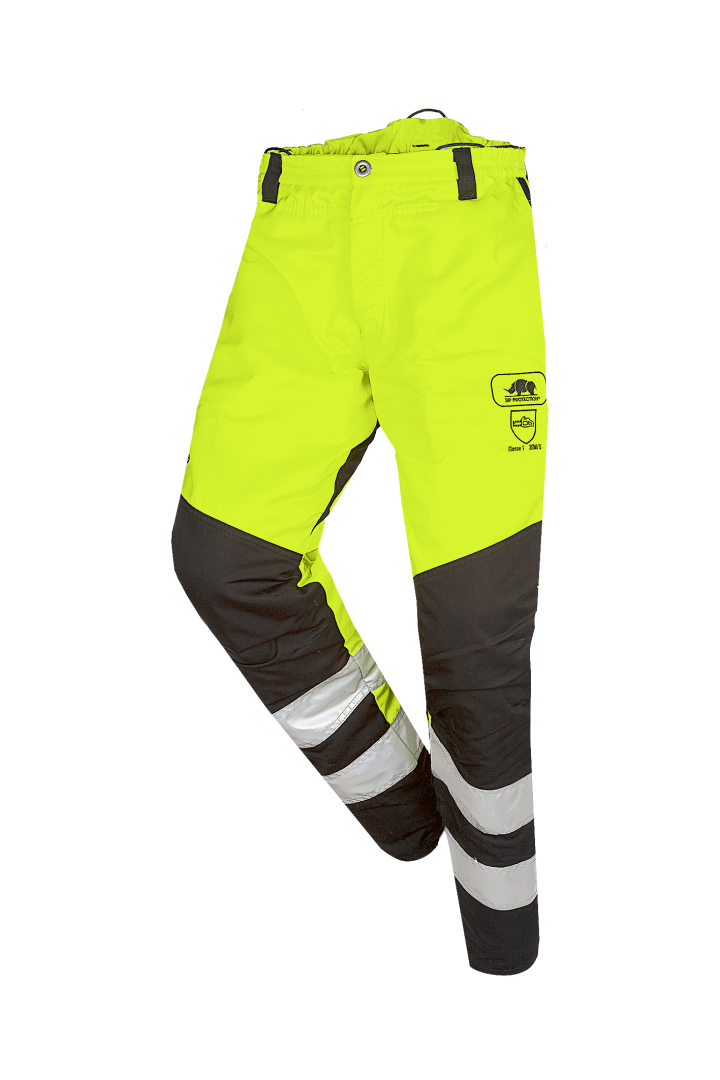 Sahausluokka 1 tyyppi A mukaiset viiltosuojahousut. Keltainen Hi-Viz väritys. Leveät heijastinnauhat lahkeissa. Joustava vyötärö sekä taskuja 2 edessä ja 1 takana. Materiaali vettähylkivää polyesteriä sekä puuvillaa.